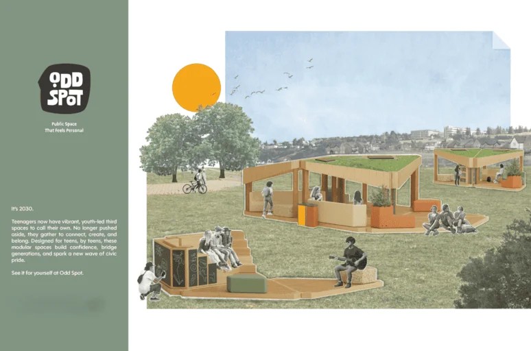 Elizabeth Cummins' project 'Odd Spot' is a modular public pavilion designed with and for teenagers to tackle the growing crisis of youth in-person social disconnection. Installed in parks and green spaces, each Odd Spot is co-designed with local 11-15-year-olds using a scaled model kit, allowing them to shape the layout and features of their space, from social seating to art walls and DJ decks.