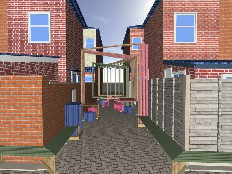 Zara Azam's project 'The Commons' is a council-funded social initiative designed to support emotional well-being through connections to place, others, and the self. Set within urban Manchester, where students and long-term residents often live side by side in traditional terrace housing, The Commons reimagines the alleyways between back gardens as shared, functional walkways.
