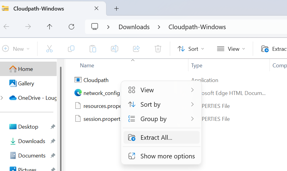 Right-click on the “Cloudpath” file and select “Extract all” from the drop-down menu.