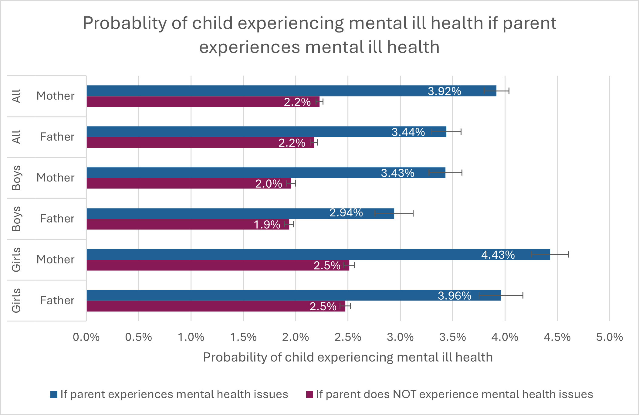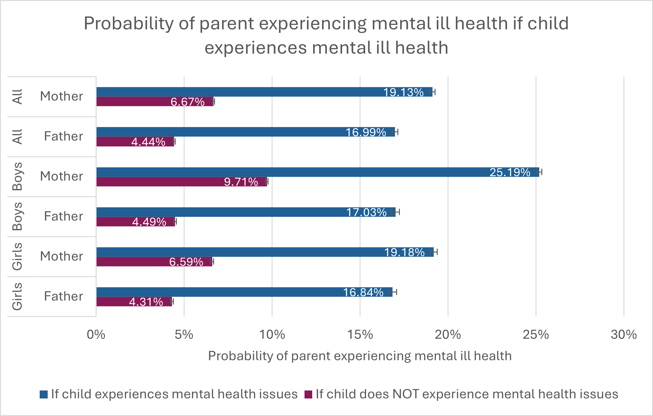 Fathers matter: paternal mental ill health has a sizeable and independent causal effect on child mental health. For boys, when both parents experience mental ill health, the probability of experiencing mental ill health is amplified.